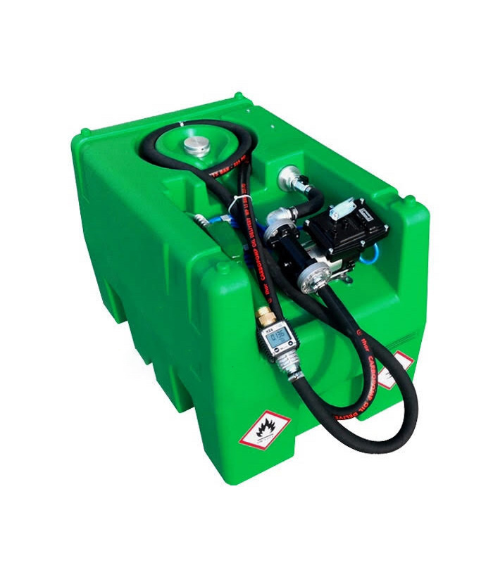 In Italien hergestellter Kraftstofftank aus Polyethylen für den Dieseltransport, ausgestattet mit abschließbarem Deckel, belüftetem Einfüllstutzen, Füllstandsanzeige, Filter, 12-V-Pumpe, 4-m-Schlauch, Automatikzapfpistole und Befestigungspunkten.